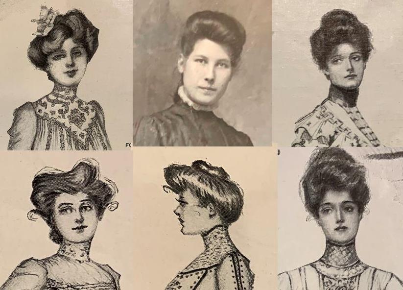 Already in 1902, we see styles similar to Teen’s. The left two ladies’ hair is more bouffant overall, but the other three’s pompadours emphasize the vertical, as Teen’s does. The woman below Teen shows what I think her hair probably looked like in profile: the slightly forward-leaning pouf above the forehead was the look you wanted, but without much pouf on the sides. The two on the right are fairly close to Teen, and suggest the look she’s after–maybe her hair didn’t have enough body to carry off the side poufs.
