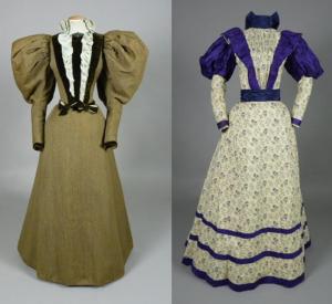 In 1895, sleeves are enormous. Whenever a style gets so extreme, it has to retreat or turn in a new direction, and sleeves now start diminishing yearly. 1896: fullness slightly tamed, ending further above the elbow. 1897: a pouf ends at the bicep, with very tight sleeves below. The skirt stays basically the same (this is not the place to go into minor construction novelties).