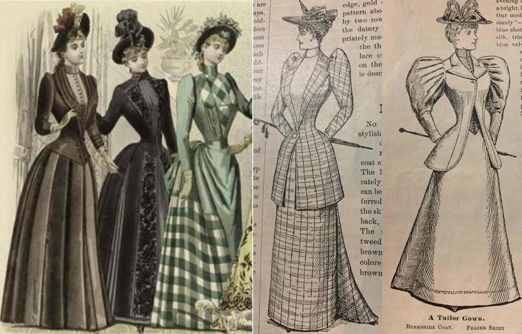 At 1890, skirts are straight, with a lingering bustle effect. By 1892 (center picture), the skirt is narrow and straight; sleeves have a bit more puff at the shoulder. In 1894, we have the A-line which we think of as typical of the Nineties, which will last for the rest of the decade, and we see the leg-of-mutton sleeves we also think of as typical.