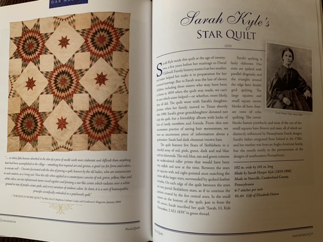 A full-size photo of each quilt is followed by a page-long (or longer) essay on the quilt and its history. Most of the quilts in the DAR’s collection have known provenance, so we know either the quilt maker, or what family or region the quilt originated in.