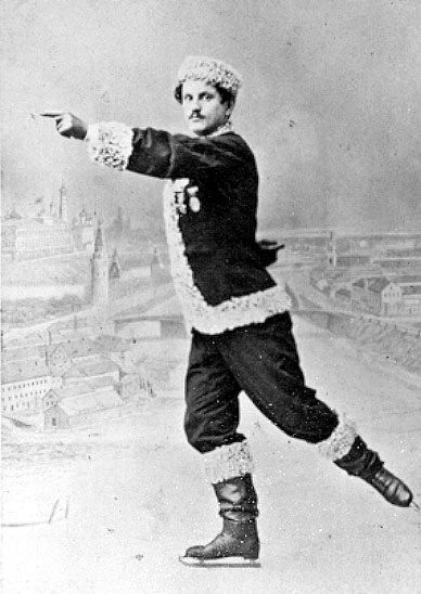 That, my dears, was a suit “à la Russe,” or Russian outfit, very specifically intended for skating. I’d swear I’ve seen a fashion illustration of this outfit, but all I can summon, thanks to costume friends, is this photo of Jackson Haines, called the father of figure skating, in a similar outfit in the 1860s: