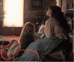 Technically Marmee should be wearing something on her head indoors, and so should Hannah–Hannah’s would be to keep dust and baking flour and whatnot out of her hair as she manages the house. But like most movies, this abandons etiquette of headwear. Not to mention the aforementioned hair…Sigh. This is why mommy drinks, as they say…)